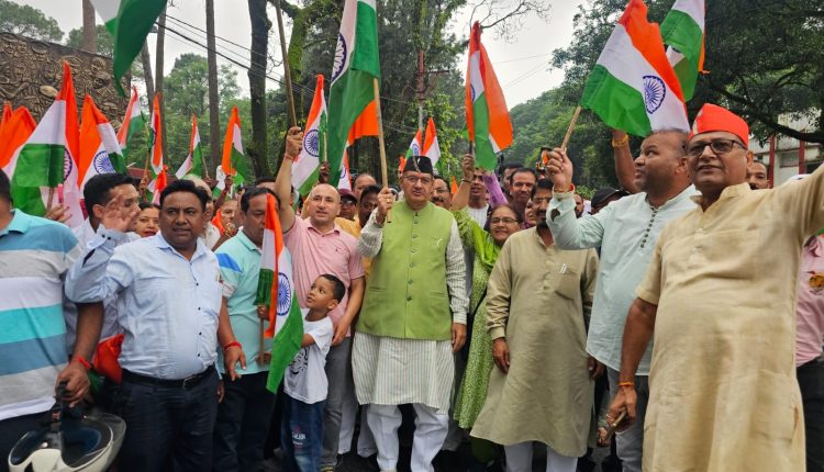 बारिश में भीगते हुए “हर घर तिरंगा” अभियान के अंतर्गत “तिरंगा यात्रा रैली” में तिरंगे को ऊंचा उठाकर गर्व से लहराते हुए कैबिनेट मंत्री गणेश जोशी