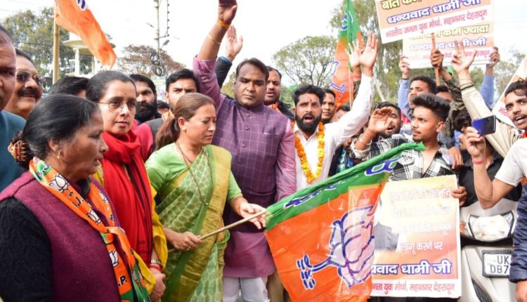 रिंकी सिंह ,देहरादून: आज देहरादून बीजेपी महानगर ने मुख्यमंत्री पुष्कर सिंह धामी द्वारा लागू किये गए सबसे सख्त नकल विरोधी कानून को लेकर धन्यवाद रैली निकाली।रैली को प्रदेश की कैबिनेट मंत्री रेखा आर्या ने हरी झंडी दिखाकर रवाना किया। जहां कार्यकर्ताओं ने प्रदेश सरकार के पक्ष नारेबाजी कर अपनी खुशी जाहिर की। कैबिनेट मंत्री ने कहा कि वह अपने सभी युवाओं से कहना चाहती हैं कि हमारी सरकार आपके हितों के लिए सदैव खड़ी है और आप सभी के हितों के साथ किसी भी प्रकार का खिलवाड़ नही होने दिया जाएगा।इस कानून से आप सभी के हित सुरक्षित होंगे और नकल करने व कराने वाले सलाखों के पीछे होंगे।कहा कि उत्तराखंड देश का ऐसा पहला राज्य है, जहां नकल करने और करवाने वाले के खिलाफ कड़ी सजा का प्रावधान किया गया है।